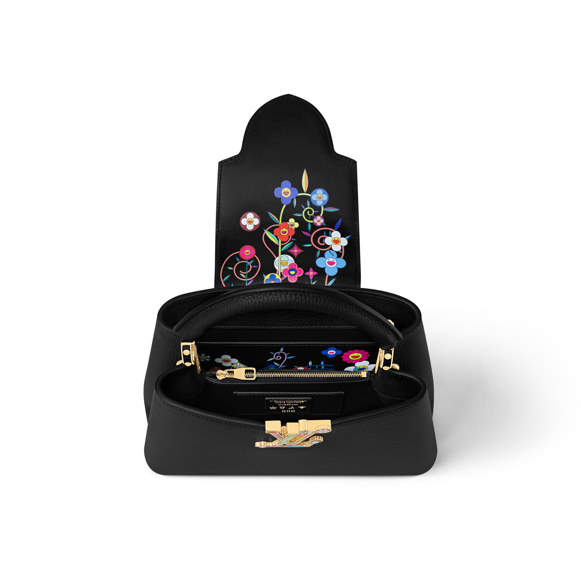 メゾンのアイコンバッグを、世界的に著名な日本人アーティスト 村上隆の陽気な美学でいきいきと再構築した「LV × TM カプシーヌ BB」。外装は淡いピンクのトリヨンレザーで仕立て、ホットピンクのカウハイドレザーのライニングと編み上げストラップでアクセントを効かせました。フロントと背面には、このアーティストを象徴する「スーパーフラット」なスタイルで表現した、オーバーサイズのパンダのキャラクターがあしらわれています。ブラックのLV イニシャルが、グラフィカルなシグネチャーでルックを完成させます。