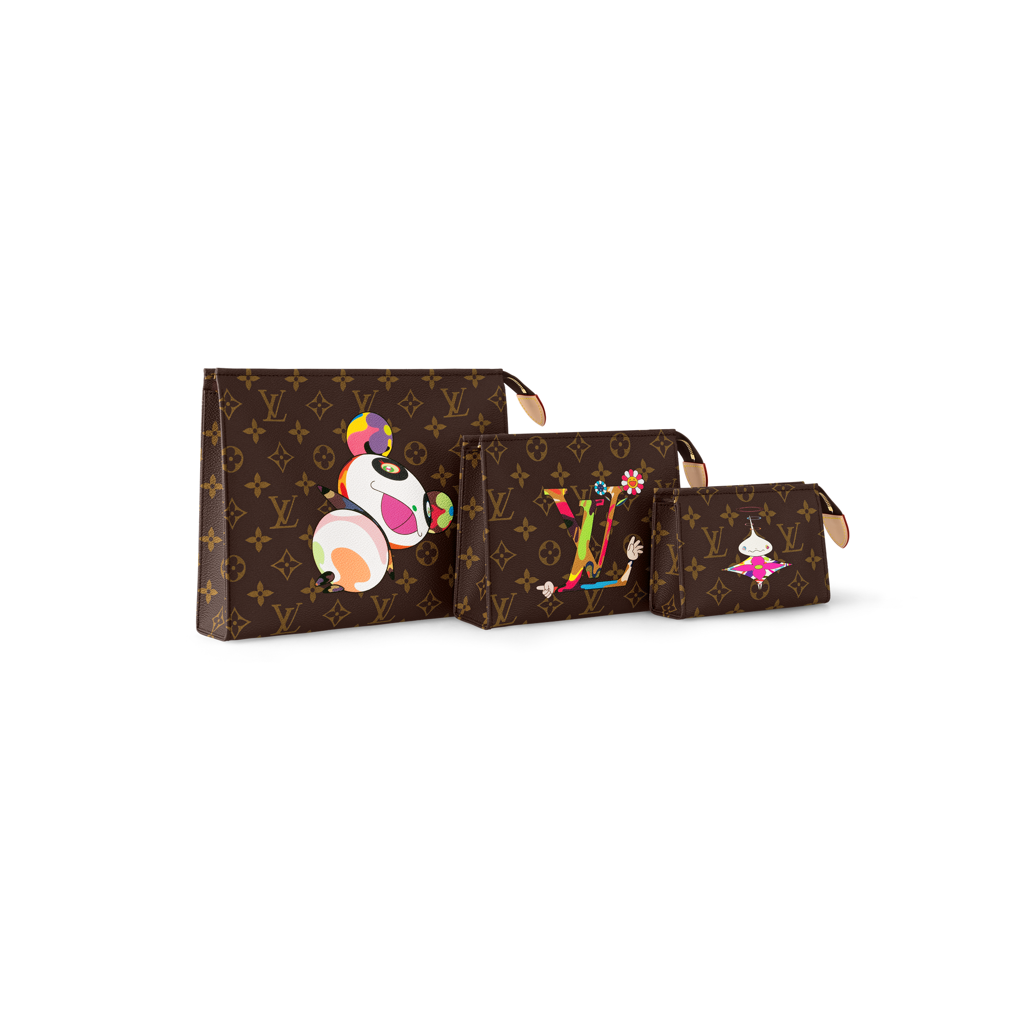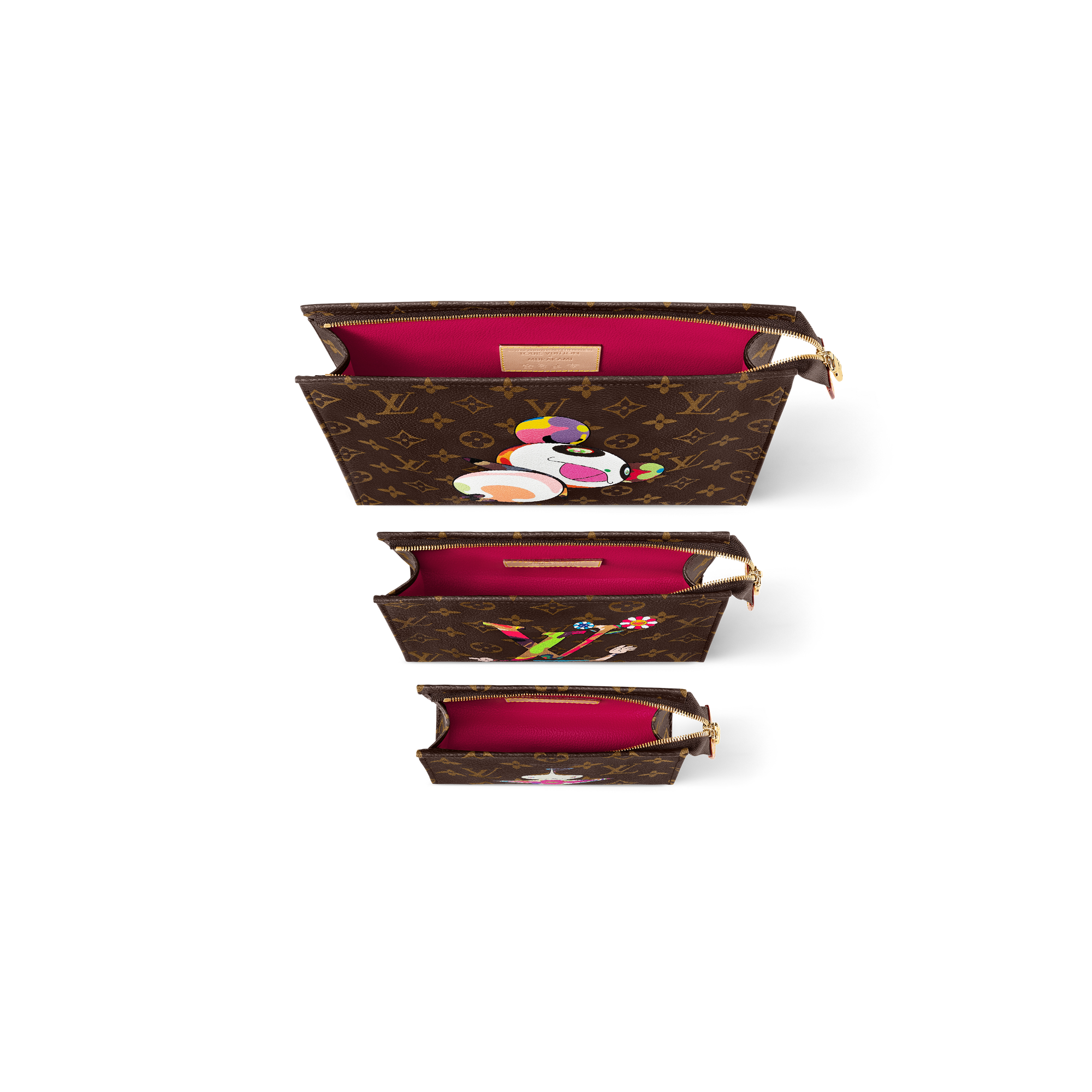 「ルイ・ヴィトン × 村上隆」コレクションのリエディションならではの陽気なディテールで、遊び心溢れる雰囲気にアップデートした必需品「LV × TM トリオ・ポッシュ・トワレ」。実用的な3つのサイズのポーチをメゾン定番のモノグラム・キャンバスで仕上げ、この日本人アーティストを象徴する「スーパーフラット」なスタイルで表現したキャラクターの数々がフロントにカラフルなステートメントを添えます。ゴールドカラーのファスナー開口部と、水拭きできる淡いピンクのテキスタイルも魅力。