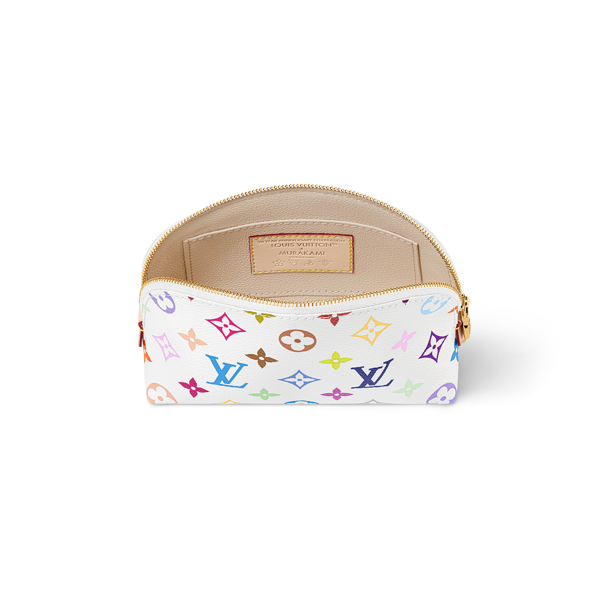 多彩なカテゴリーで展開する「ルイ・ヴィトン × 村上隆」コラボレーションの一部として登場した、カラフルでコンパクトな必需品「LV × TM ポシェット・コスメティック PM」。この世界的に著名なアーティストならではの遊び心溢れるレインボーカラーでメゾンのアイコニックなシグネチャーを再解釈したモノグラム・キャンバスで仕上げました。ゴールドカラーのファスナー開閉式。小物を収納できるフラットポケットを備えた、実用的な水拭きできるライニングも魅力です。