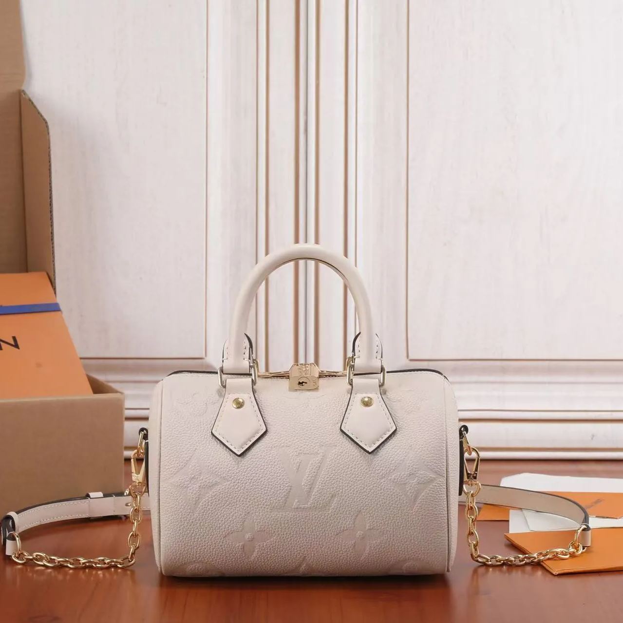 メゾンならではのクラシカルなシルエットに仕立てたスピーディバンドリエール 20。クリーム色のモノグラムアンプラント レザーに同系色のマイクロファイバーでライニングを施し、タイムレスでエレガントな雰囲気にアップデートしました。20世紀初頭から活躍を続けるルイヴィトンの旅行鞄を彷彿させる、ユニークなラインと2本のトップハンドルも魅力。取外し可能なチェーンとレザーのストラップで、ショルダーキャリーやクロスボディキャリーもお楽しみいただけます。