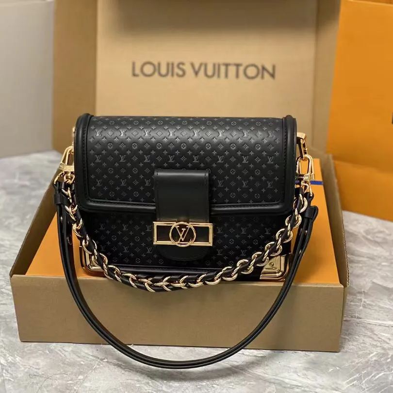 しなやかなカーフレザーで仕立てた「ドーフィーヌ MM」。新たなナノサイズのモノグラムパターンをエンボス加工してから、さりげないコントラストを描く色合いでプリントを施しました。内側に2つのコンパートメントと、レザーとチェーンを編み合わせた取外し可能なストラップを備えた、日常使いに最適なバッグです。メタリックに輝くコーナー部分とアングルブラケットが、ルイヴィトンのトランクメーカーとしてのDNAを伝えます。