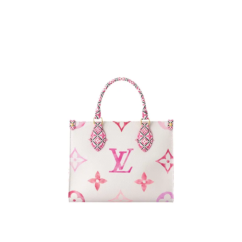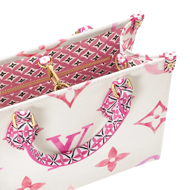 クリーム色のキャンバスをパステルカラーのモノグラムジャイアント パターンで彩った、ハンドバッグサイズのトートバッグオンザゴー PM。トリミングとトップハンドルには、ポルトガルの伝統的なタイルであるアズレージョから着想を得た緻密なモノグラムフラワー タイル パターンをあしらいました。取外し & 調節可能なストラップで、ショルダーキャリーもお楽しみいただけます。