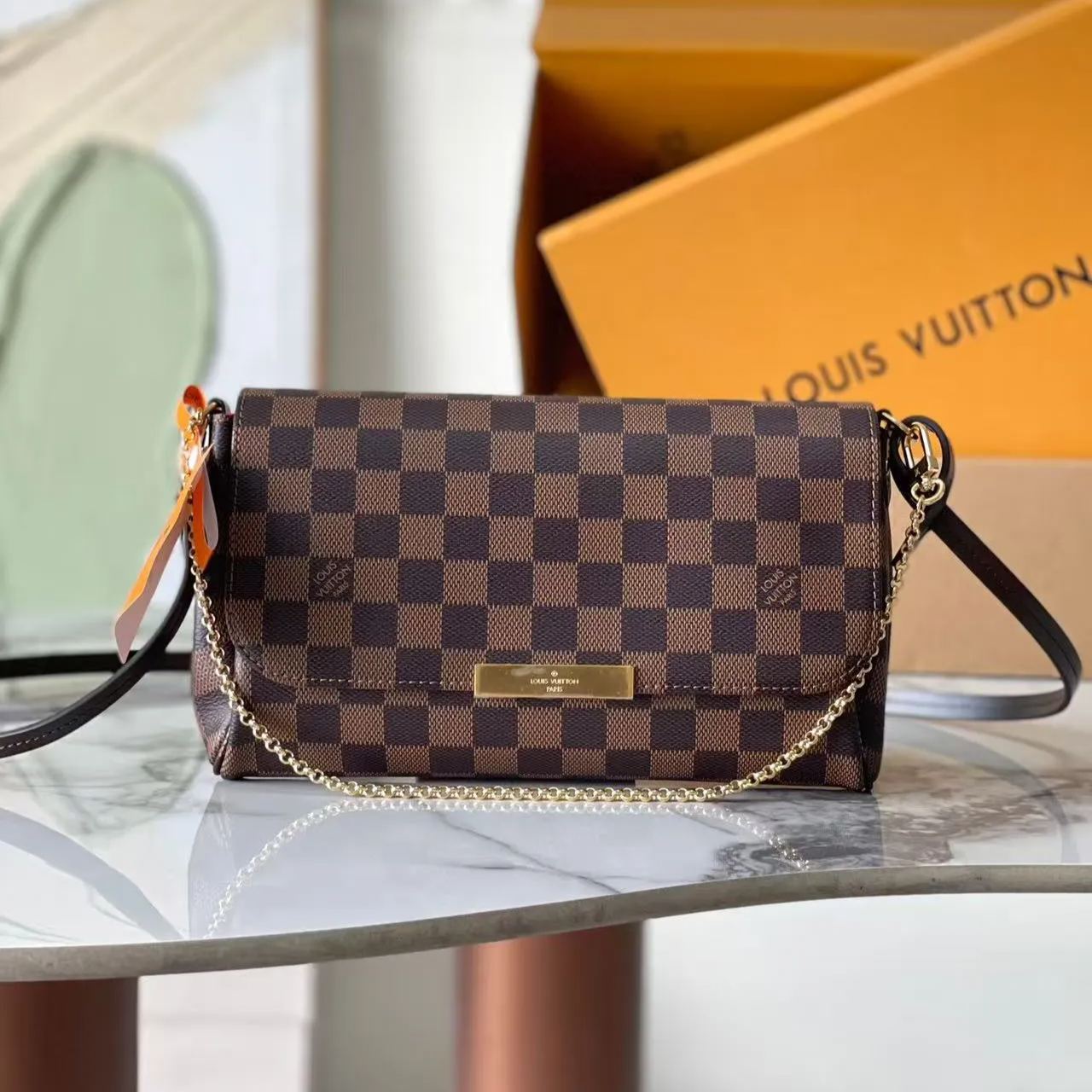 デイタイムからイブニングシーンまで、スタイリッシュな女性を虜にする「フェイボリット MM」。ルイヴィトンならではのグラフィカルなダミエキャンバスが存在感を放つデイタイムからイブニングシーンまで活躍する一品です。クラッチのように持つこともでき、ゴールドカラーのチェーンでショルダーバッグとして、またはレザーストラップでカジュアルにクロスボディバッグとしてなど、さまざまな持ち方をお楽しみいただけます。刻印を施したフロントプレート部分は、持ち物をしっかり保護するマグネット開閉式。