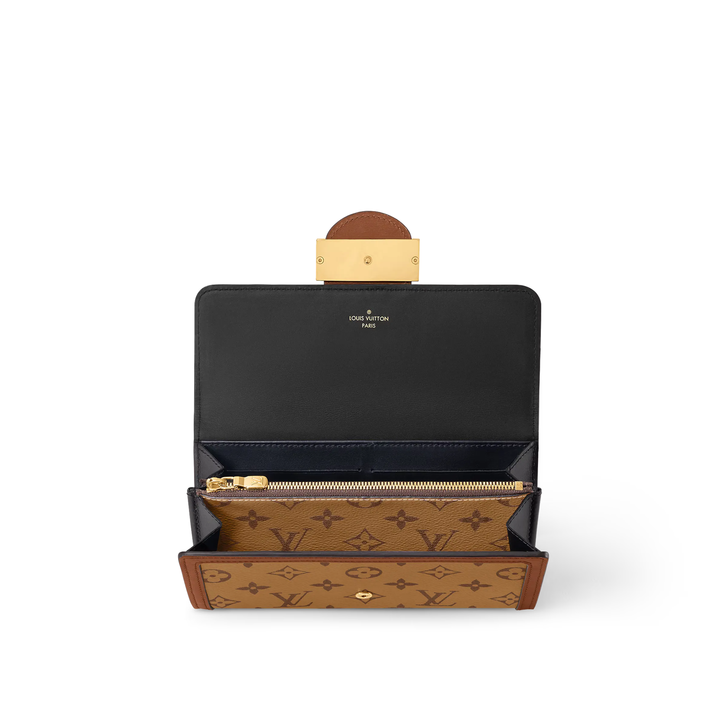 定番の財布ポルトフォイユサラをドーフィーヌラインを特徴付ける上品なシグネチャーを散りばめて再解釈したポルトフォイユサラ ドーフィーヌ。モノグラム & モノグラムリバース キャンバスを組み合わせ、カーフレザーのトリミングとヴィンテージ調のLV サークルのクラスプを施しました。モノグラムリバース キャンバスであしらった12のカードスロットとファスナー付きコインポケットを備えた機能性が、デザインを引き立てます。