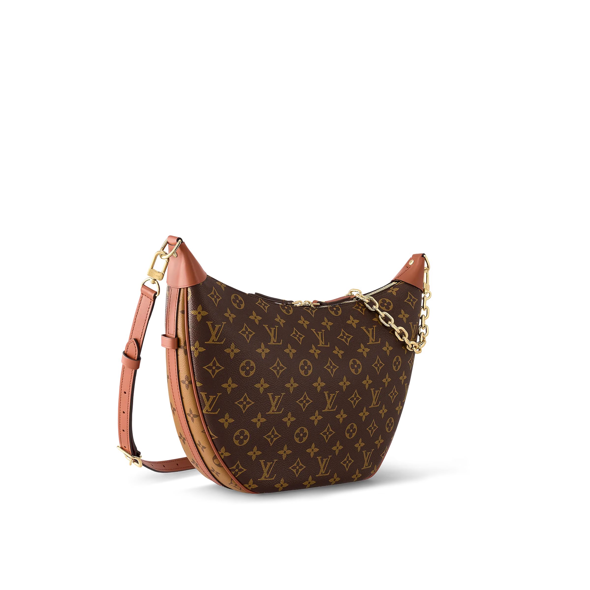 モノグラム & モノグラムリバース キャンバスを組み合わせた、洗練された雰囲気と大容量が魅力のループホーボー。トレンディな半月型のフォルムを、レザーのコーナー部分が引き立てます。さまざまな持ち方をお楽しみいただける、取外し可能なチェーンと、取外し & 調節可能なレザーストラップ付き。