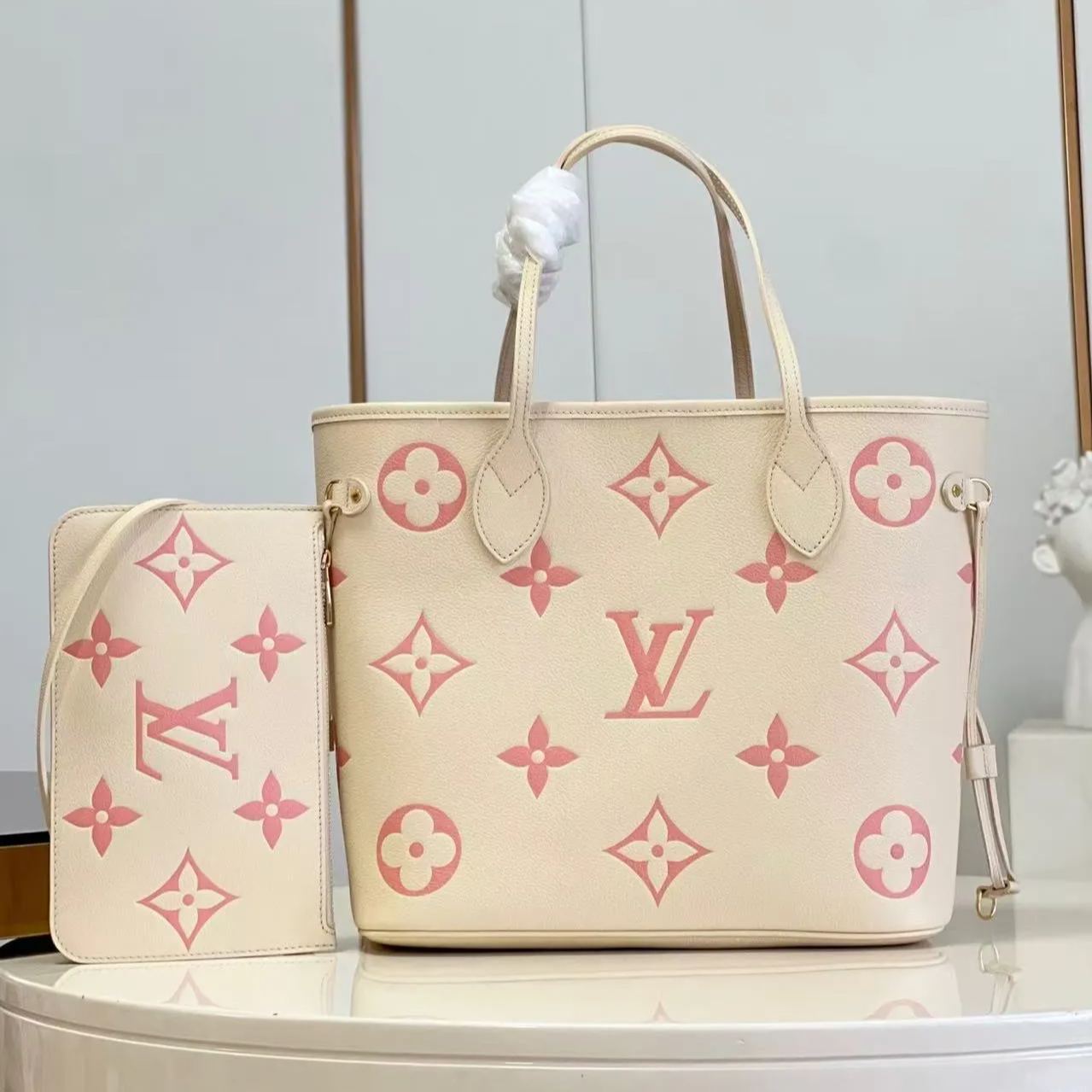 エレガントなバイカラーのモノグラムアンプラント レザーが、今シーズンならではの装いに春らしい印象を添える「ネヴァーフル MM」。サイドレースを締めれば洗練されたシルエット、緩めればカジュアルな雰囲気の2通りの表情がお楽しみいただける、大容量のアイテムです。快適な使い心地を実現する、2本の長めのレザーストラップ付き。