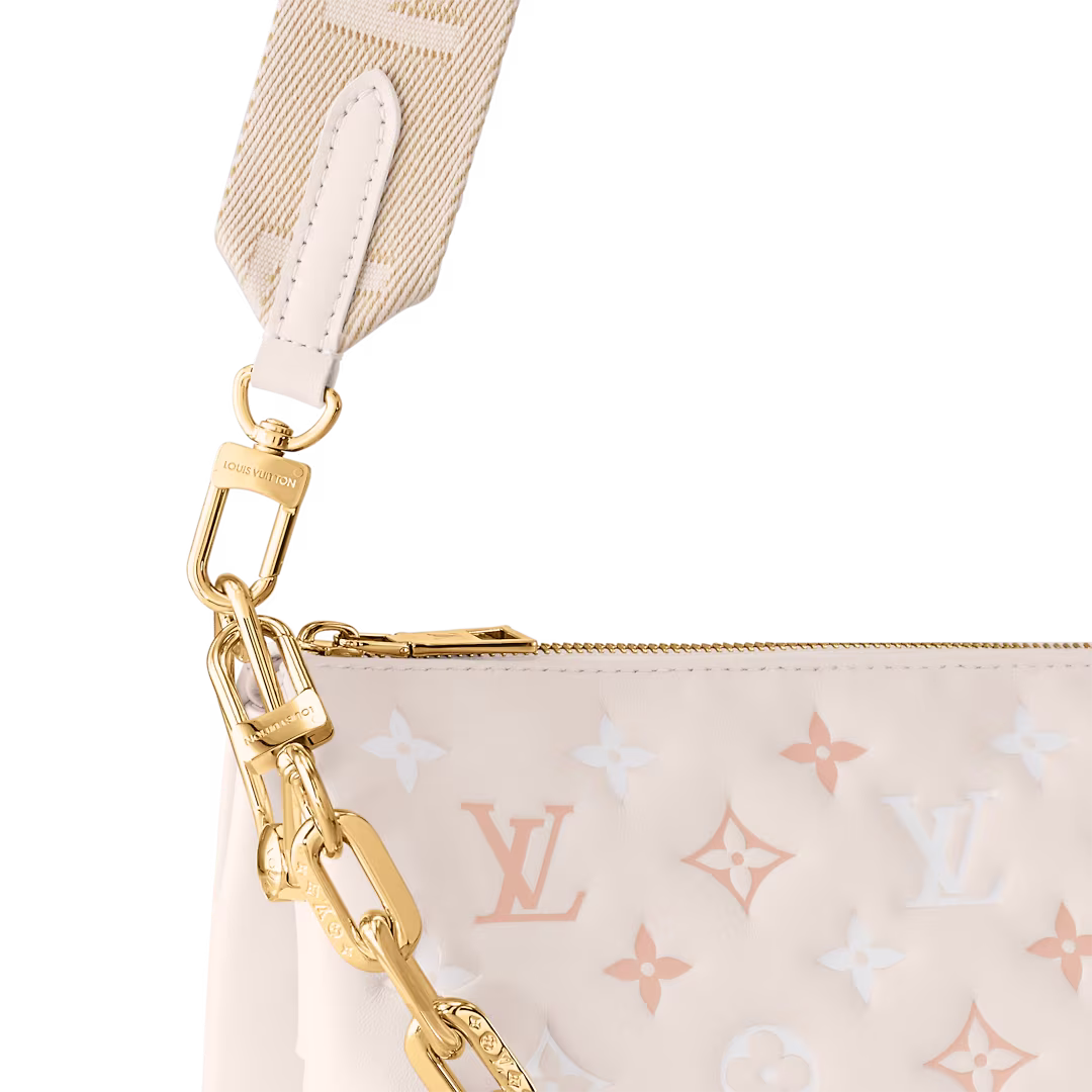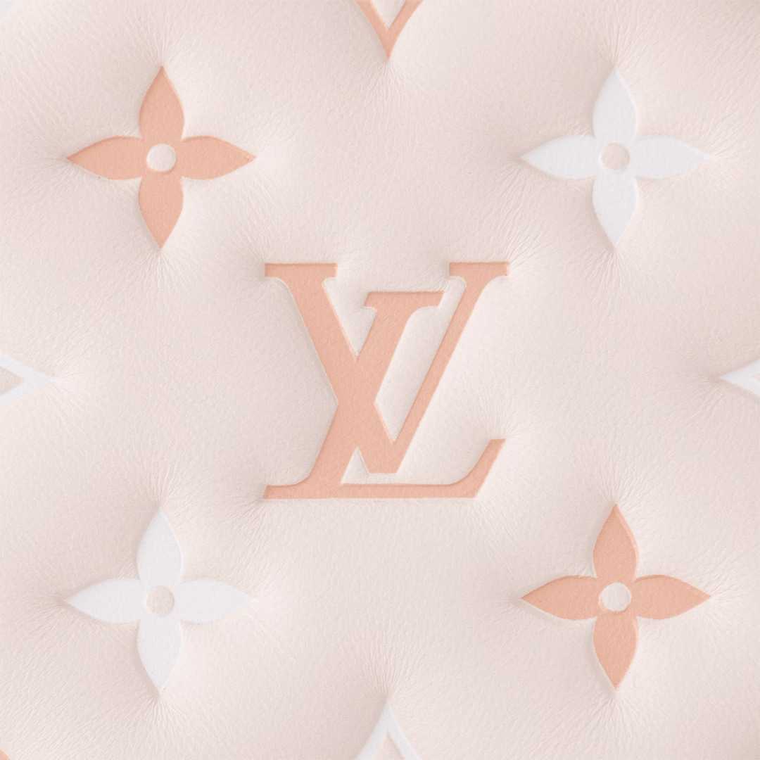 今シーズンならではの明るい色調で彩ったクッサン PM。ピローのようなパフ感溢れるラムレザーにモノグラムパターンのエンボス加工を施し、暖かな季節にぴったりのシルエットに仕上げました。チャンキーなゴールドカラーのチェーンでショルダーキャリーでも、幅広のテキスタイルストラップでクロスボディバッグとしてもお楽しみいただけます。